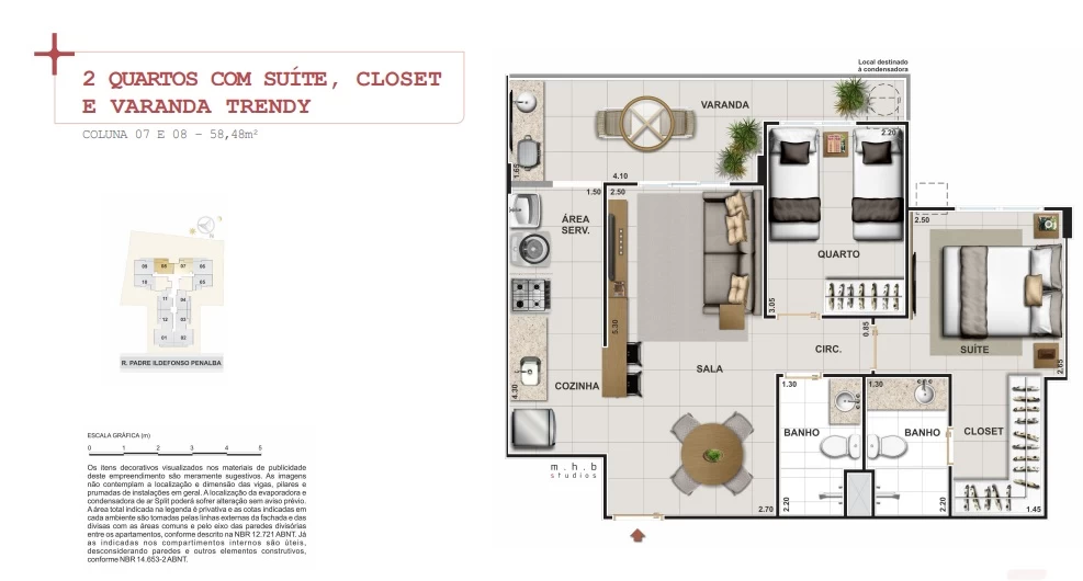 Apartamentos de 2 quartos com 58m².