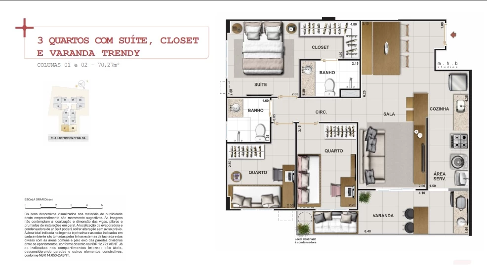Apartamentos de 3 quartos com suíte 70m².